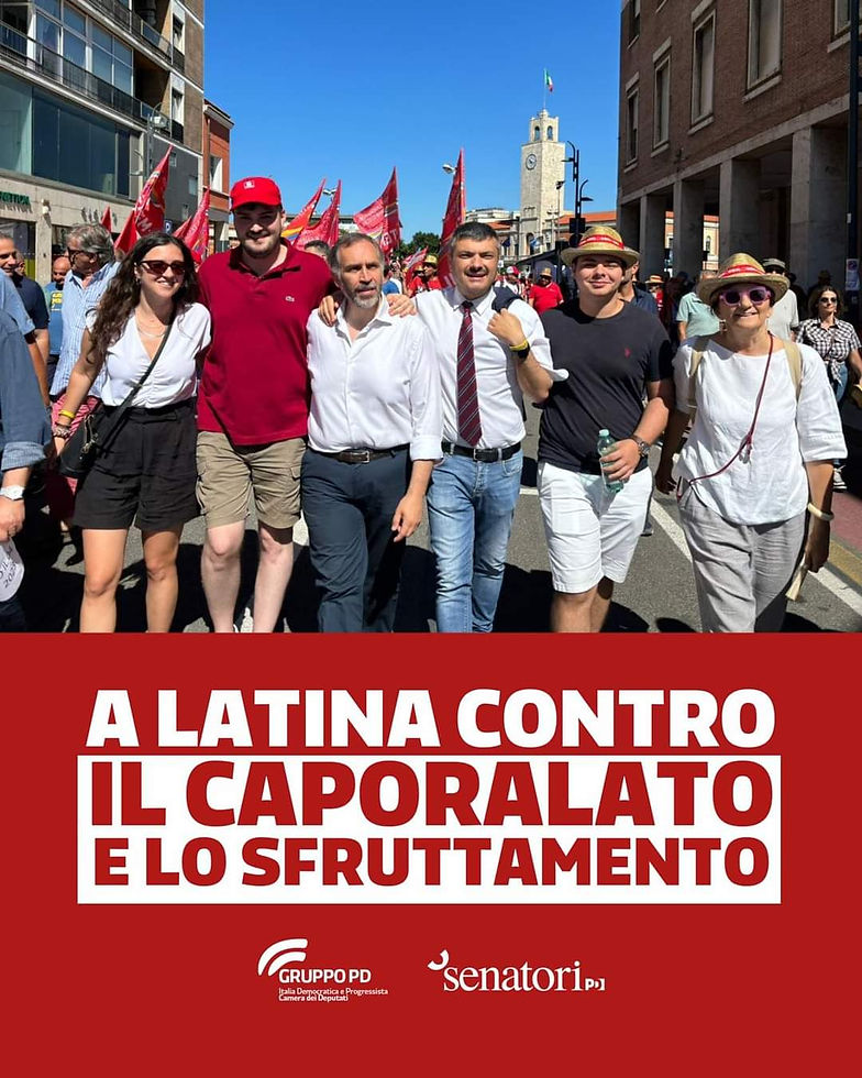 In piazza a Latina con la delegazione del Partito Democratico alla Manifestazione nazionale della CGIL al fianco di Annalisa Corrado, Camilla Laureti, Cecilia D'Elia, Filippo Sensi insieme a Valeria Campagna, Ludovico Di Traglia, Simone Acquasanta e tantissime e tantissimi altri, per ricordare Satnam Singh e tutte le vittime del caporalato, contro lo sfruttamento, per la sicurezza e la dignità sui posti di lavoro.