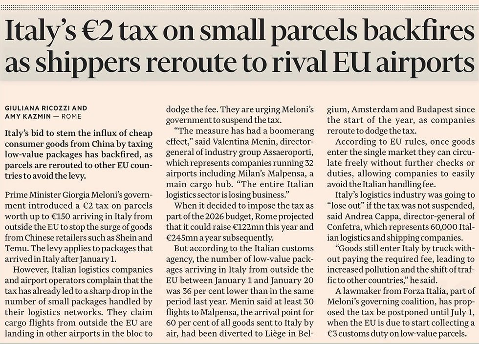 Il Financial Times conferma il fallimento della tassa Meloni di 2 euro sui pacchi extra UE che sta dirottando le spedizioni verso gli altri paesi europei: Governo intervenga per cancellarla prima che figuraccia internazionale faccia giro del mondo. L’auto dazio imposto dall’ultima manovra non sta colpendo solo le imprese della logistica italiana ma anche la credibilità dell’Italia.